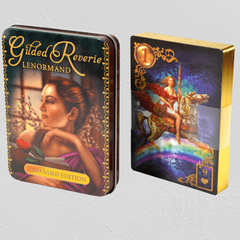 Baralho Cigano Gilded Reverie Lenormand, versão estendida com acabamento em dourado e caixa de metal, com 44 cartas e mais 3 cartas extras a Coruja, o Homem e a Mulher.